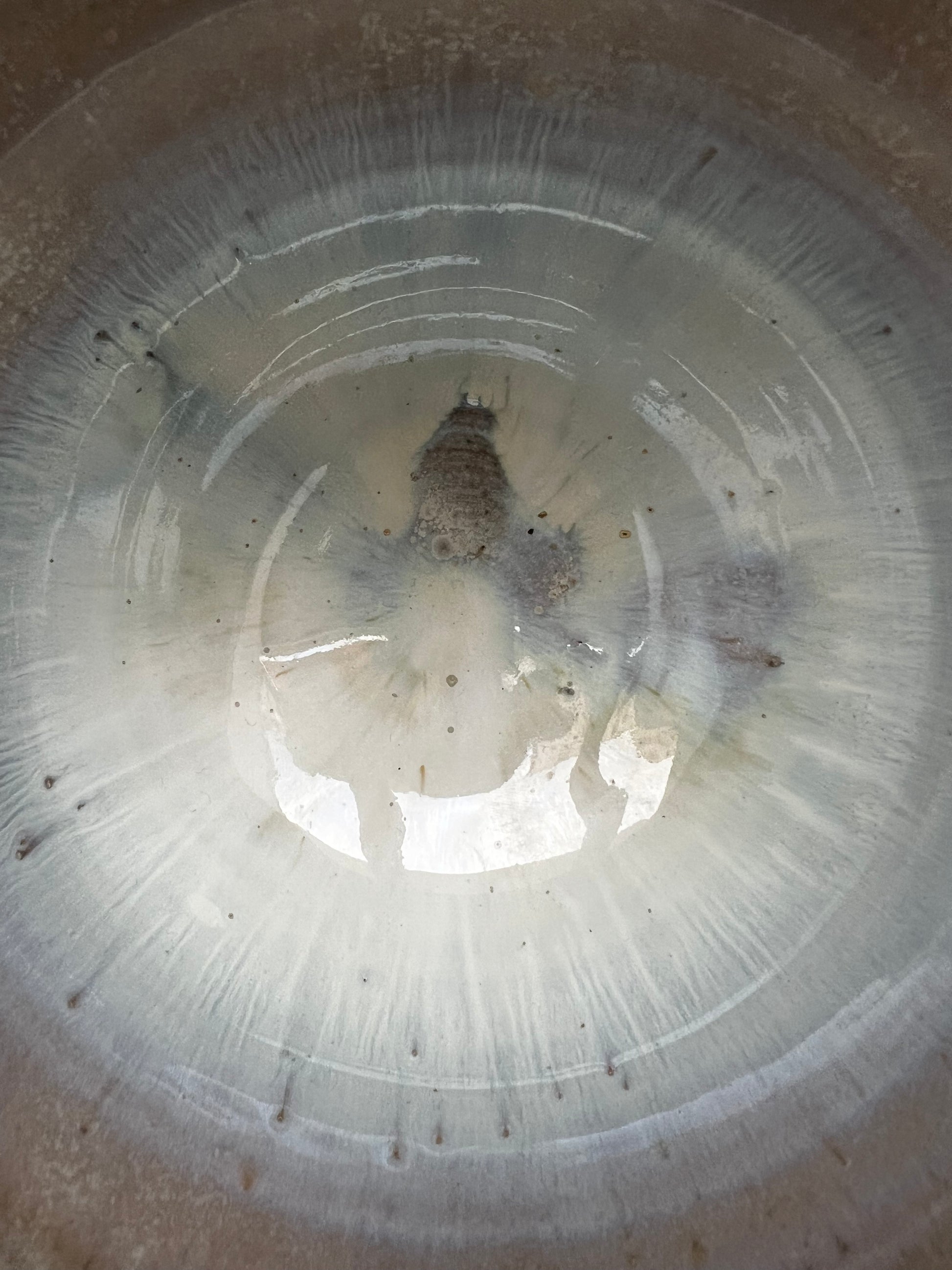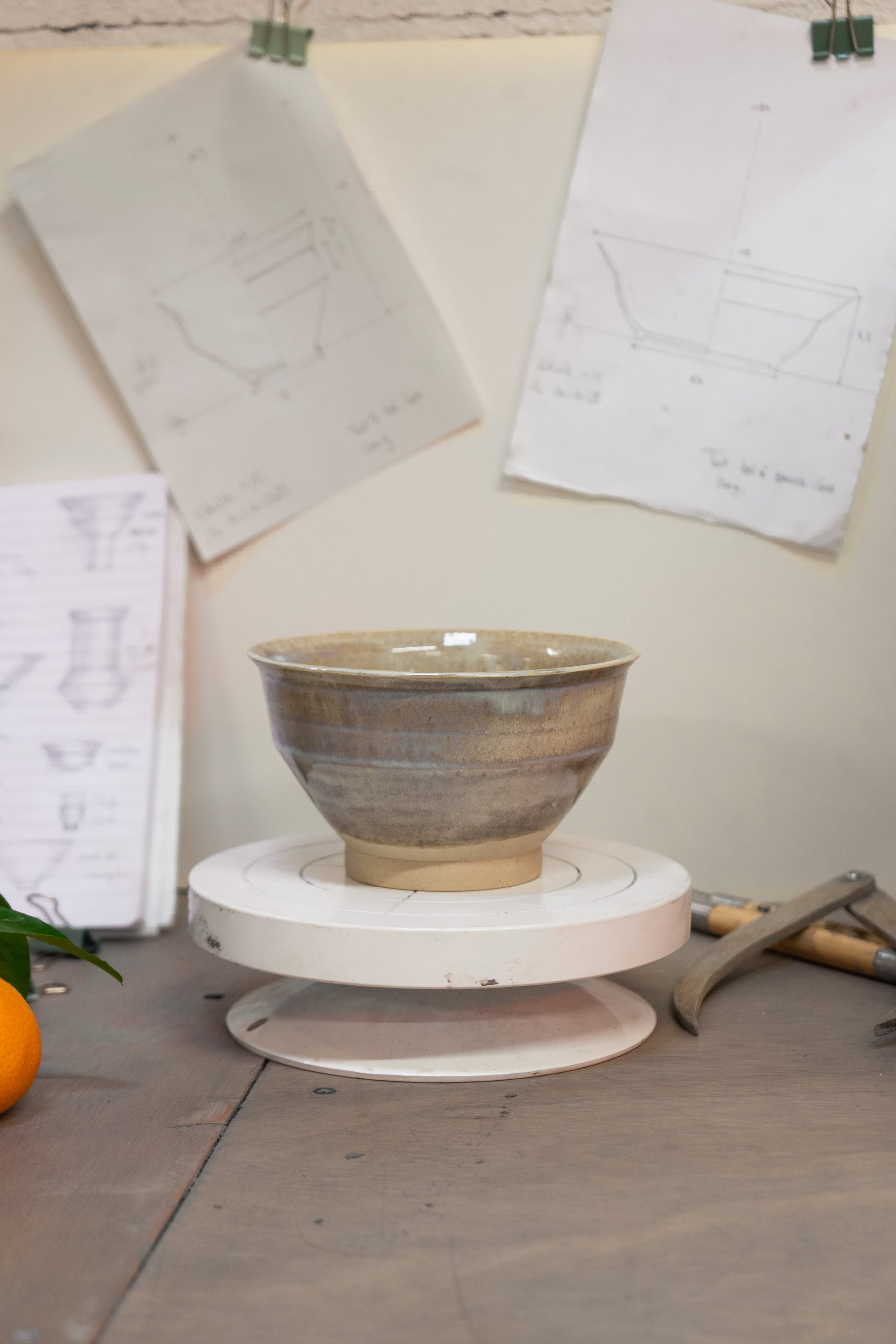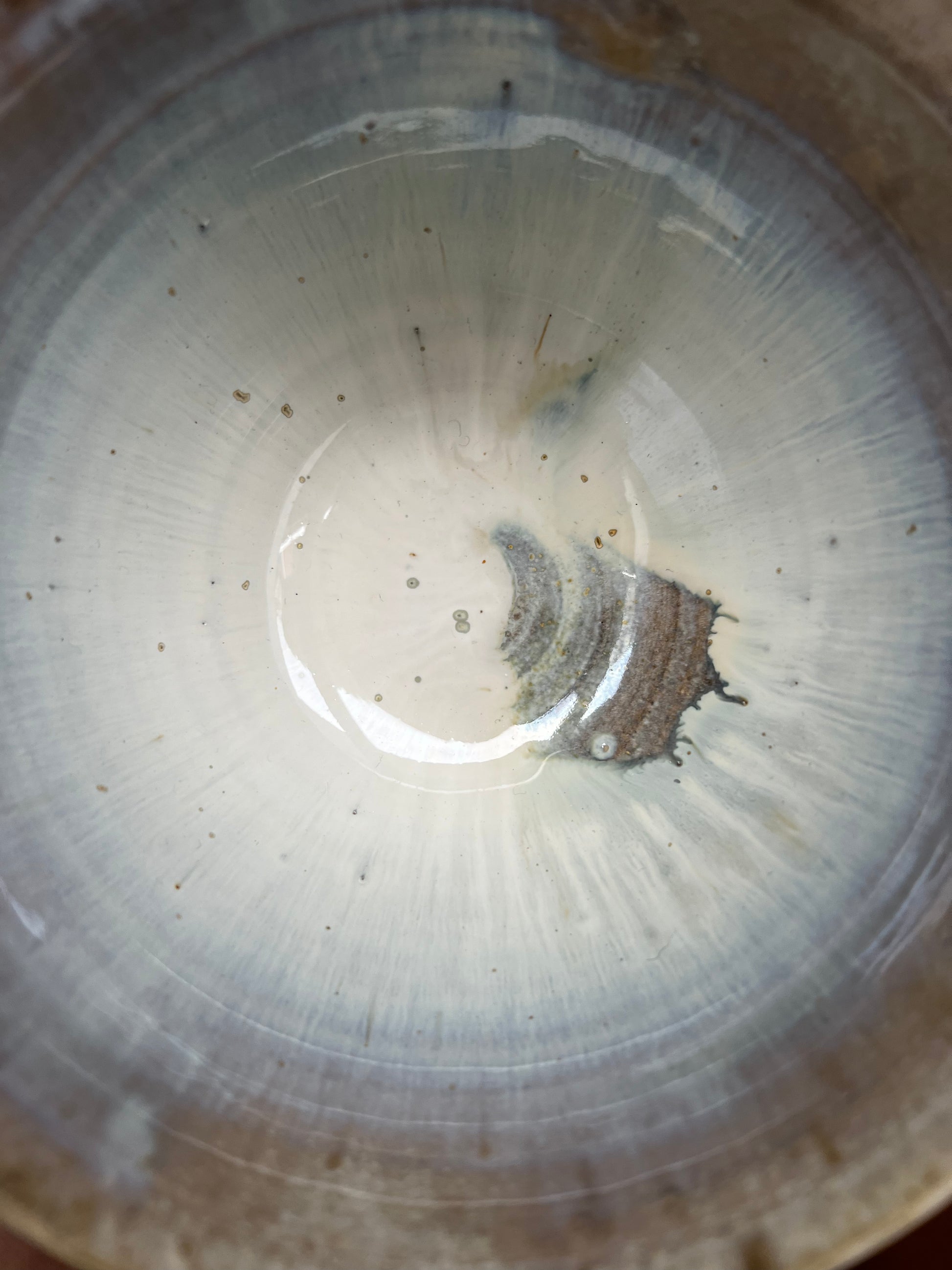 Un bol aux lignes modernes, marqué par des angles subtils et un pied soigneusement tournassé. Son émail beige aux coulures nucléés d’irisations, transporte dans un univers hors du temps, comme les écumes figées dans le vent.