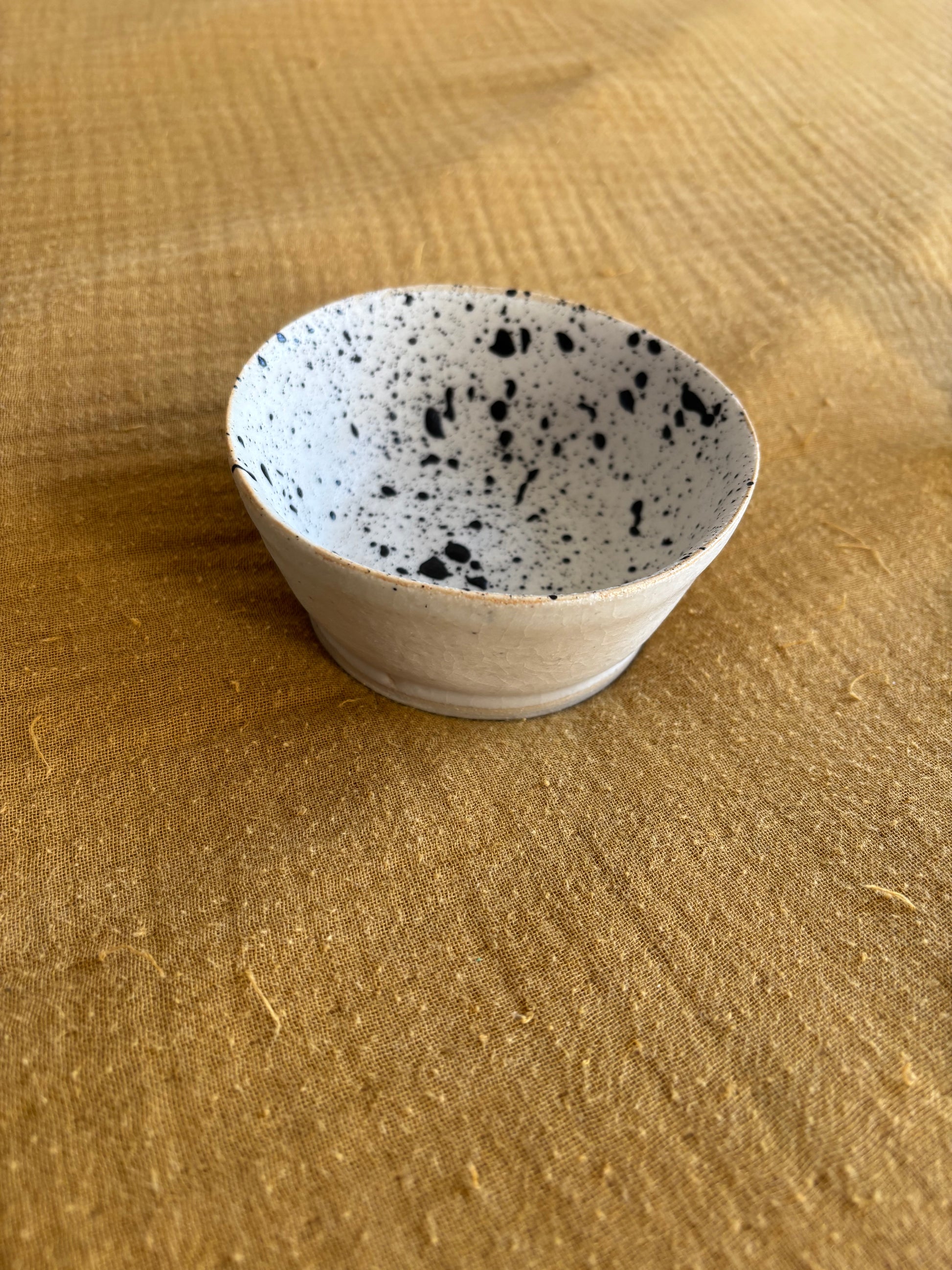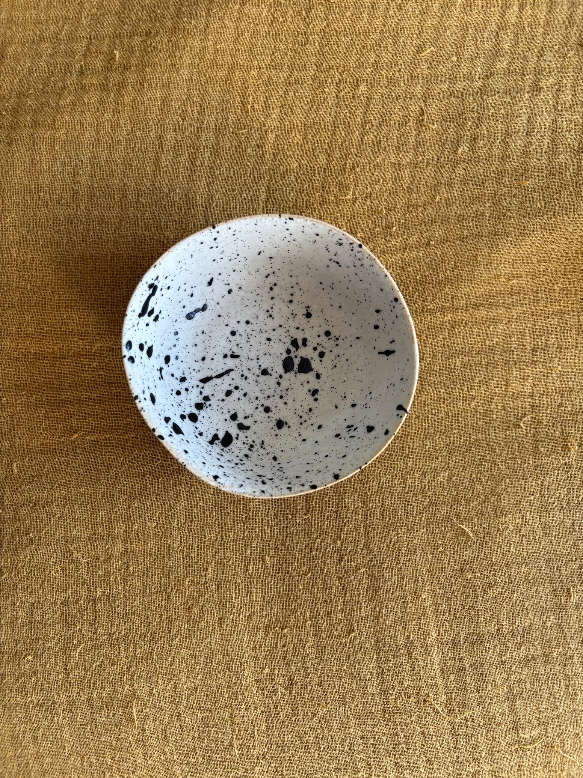 - Matériaux : Terre de Saint-Amand émaillée à la main avec une finition blanc tacheté.