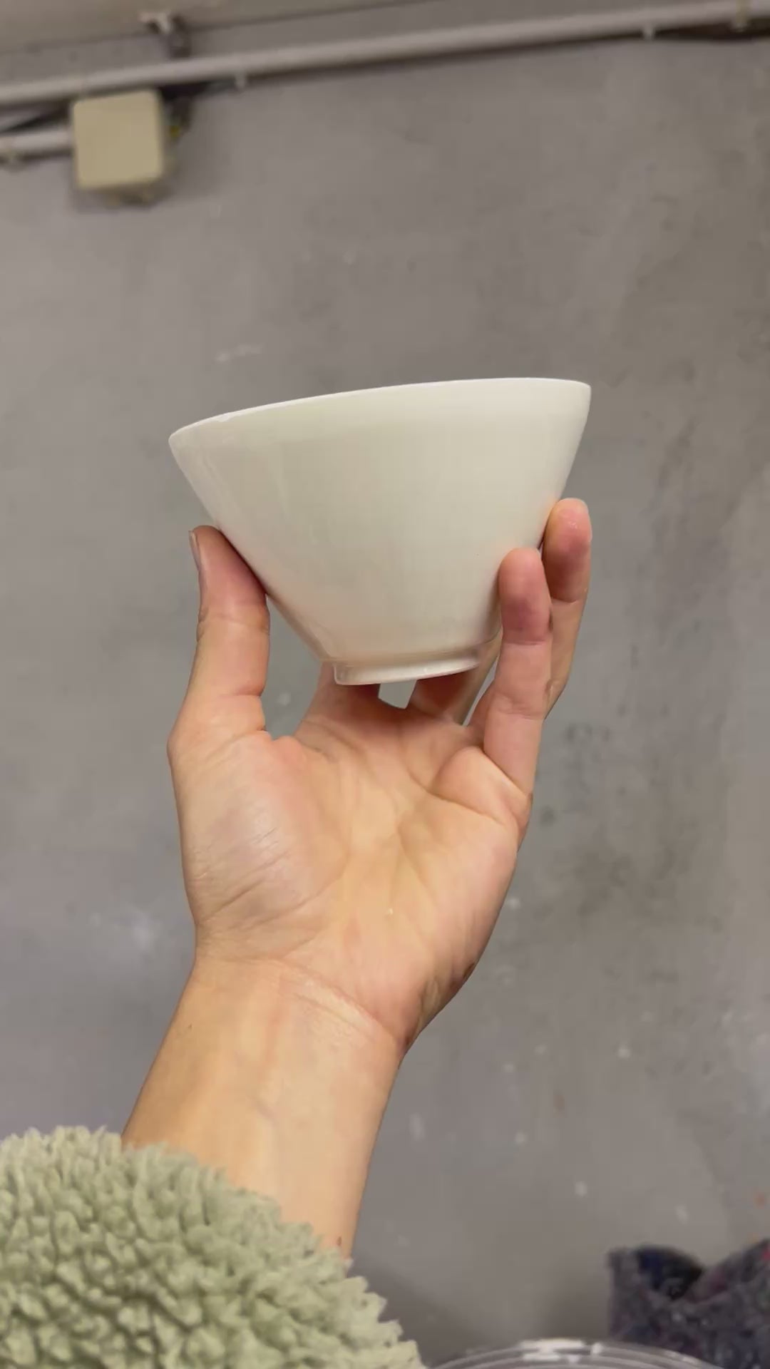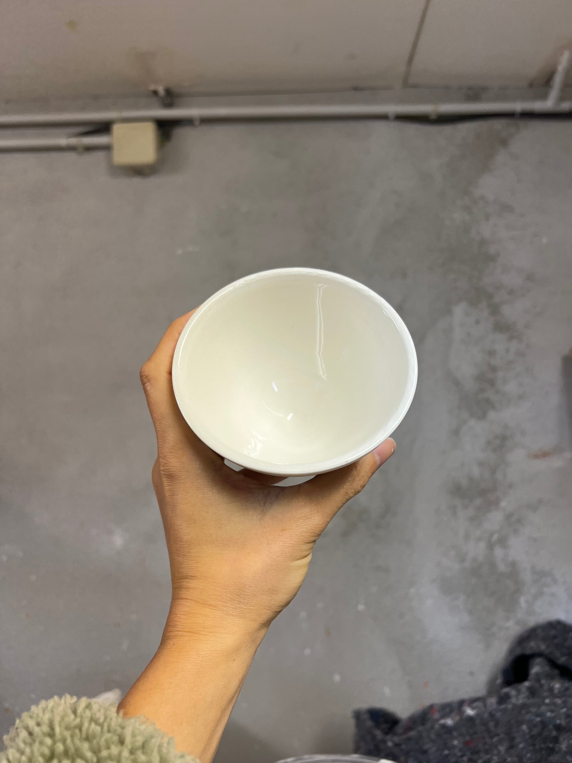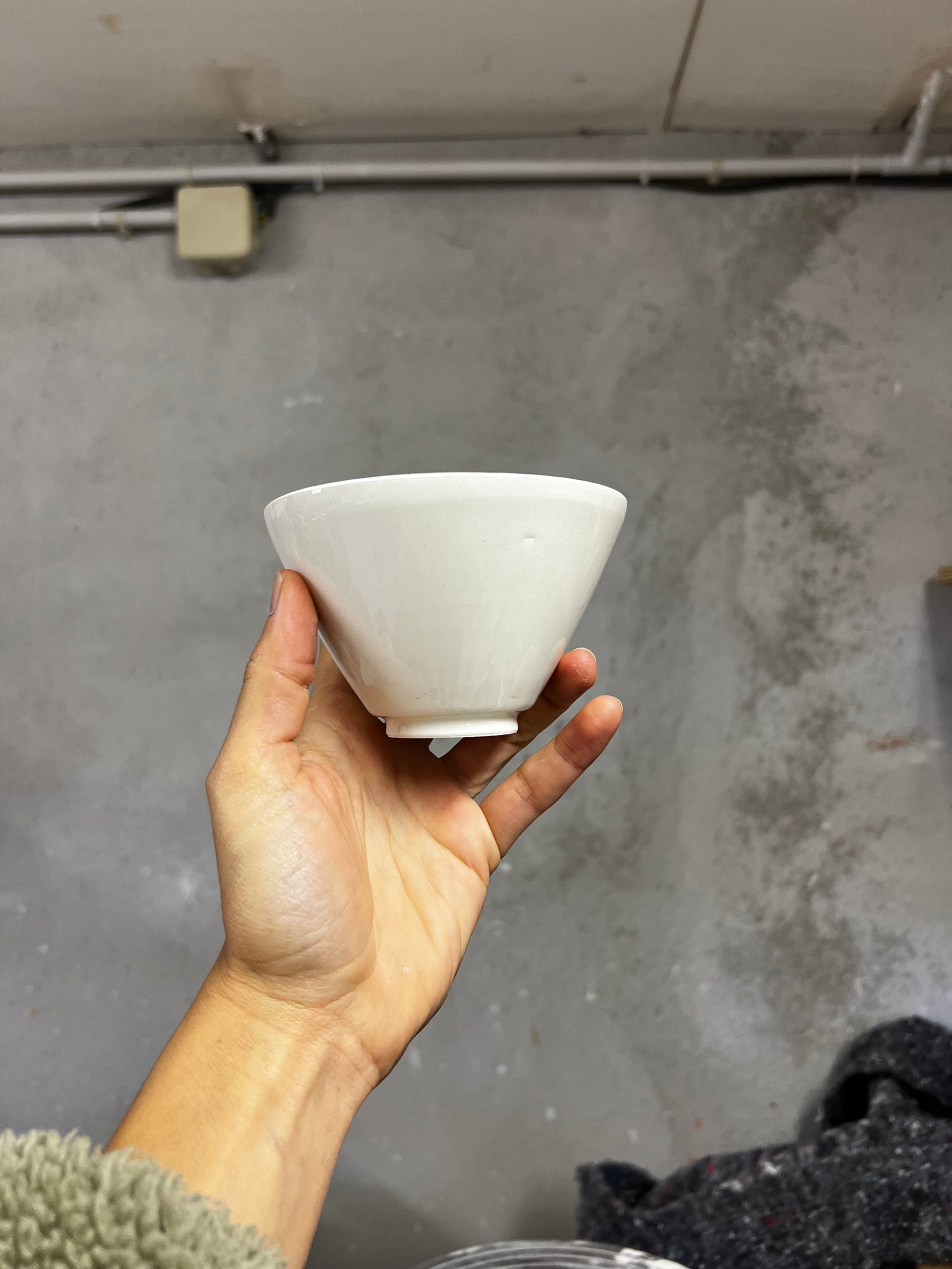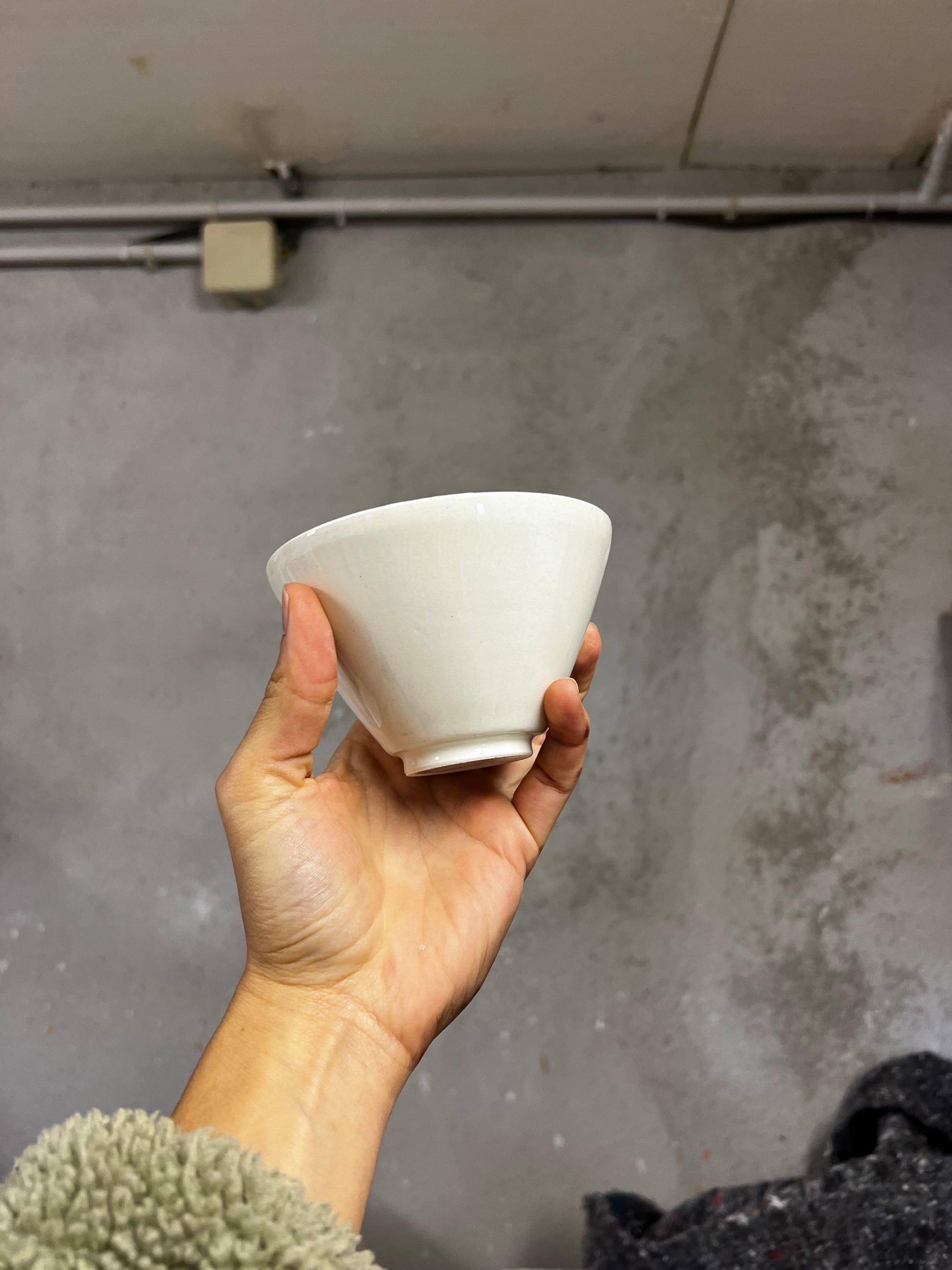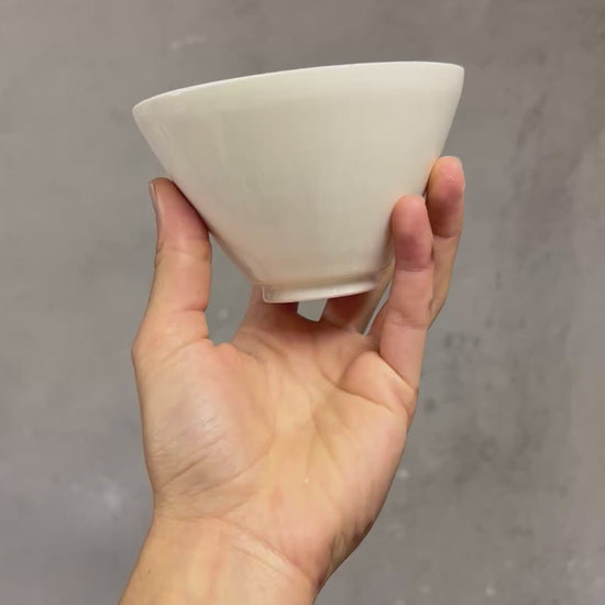 Un bol à thé a la forme traditionnelle japonaise SUGI NARI, au pied soigneusement tournassé. Son émail transparent laisse apparaître le blanc de la faïence, révèle les textures subtiles laissées par les doigts et les outils, et la douceur du mouvement de la terre.
