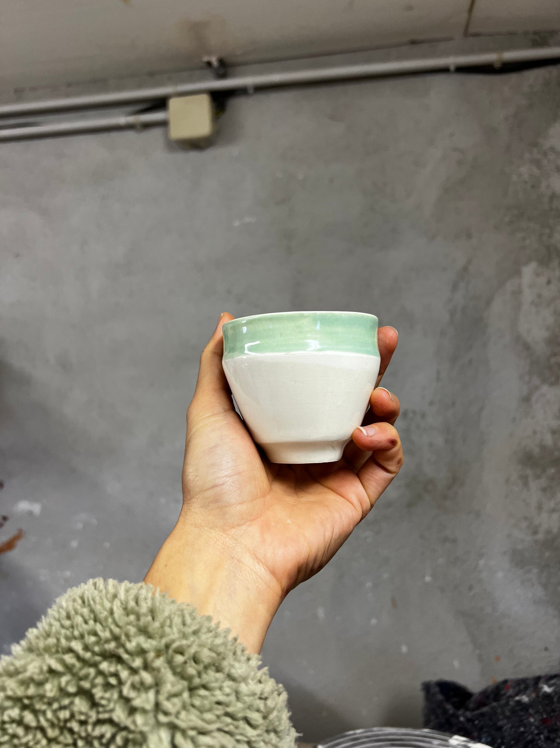 Une petite tasse expresso aux lignes simples et modernes, tournée à la main puis tournassée pour offrir un pied délicat et une tenue équilibrée. Son émail blanc légèrement teinté de vert révèle la texture de la faïence et apporte une douceur visuelle idéale pour les moments de pause.